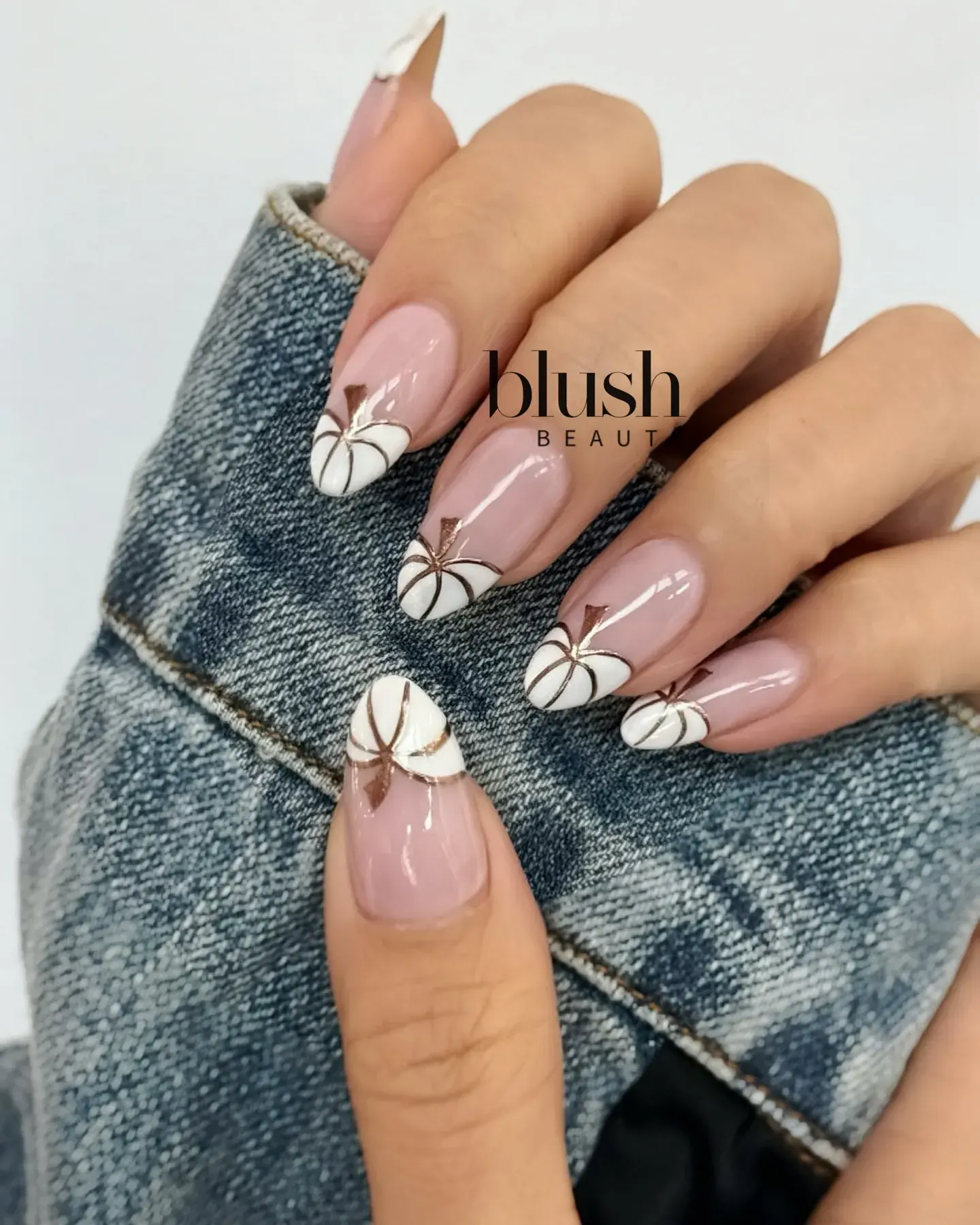 Soft peachy pink paired with shiny copper chrome tips and foil leaves for a polished fall-ready look.